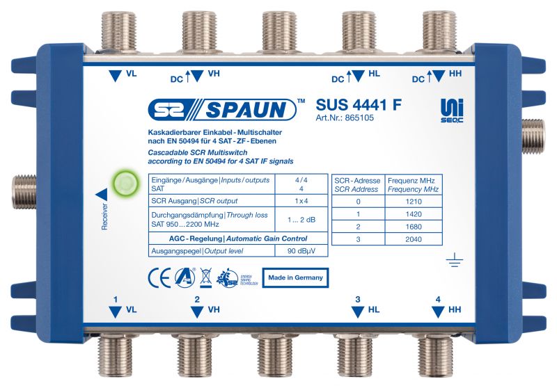 Receiver powered SCR multiswitch for the distribution of 4 SAT IF positions through one output onto four receivers, Automatic gain control, according to EN 50494