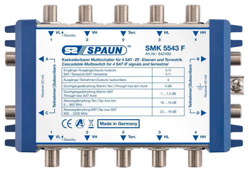 Cascadable multiswitch for 4 SAT IF signals and terrestrial 4 subscribers