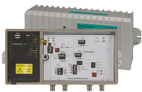Flexible home distribution amplifier with built-in return path, jumper adjustment- jumper configuration- return path included- amplification forward range and return path pluggable, low noise by bypassing a single stage- excellent amplitude frequency response- test point on input and output