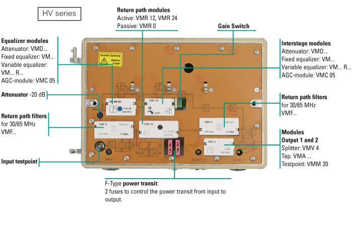 The HV-series broadband amplifiers build a full amplifier system for the expansion of full service networks. The amplifiers are designed to complete both current and especially future tasks in such networks, as with the currently available plug-in modules a very wide range of requirements can be covered and subsequently adjusted with only a few base types without problems.